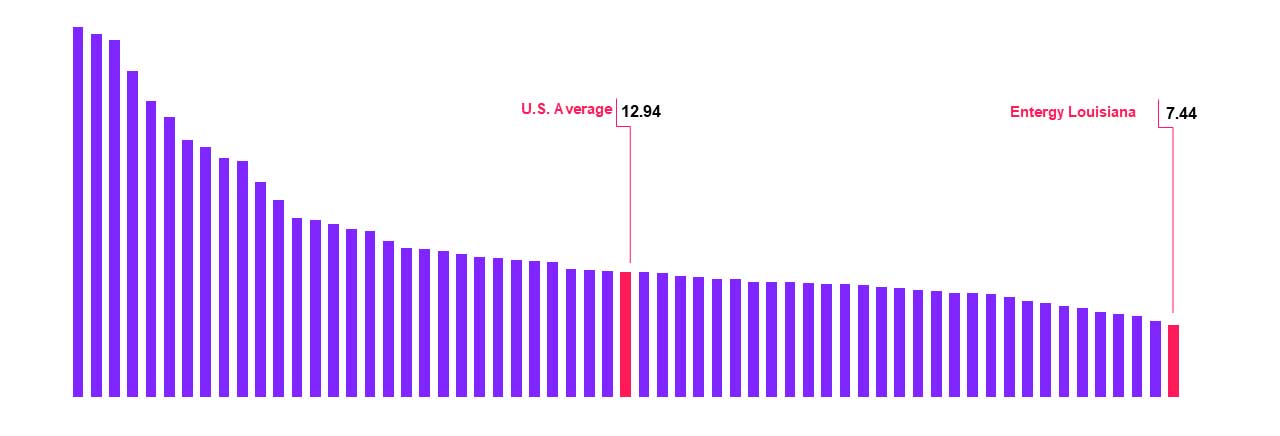 Data source: 33% reflects the residential rate average difference for 2024 and is sourced from the U.S. Energy Information Administration. The rates noted in the bar graph reflect the U.S. national average and Entergy Louisiana average across all customers. EIA rate comparison data does not include any securitized riders, taxes or fees. Securitized riders typically include storm restoration costs, for example.
